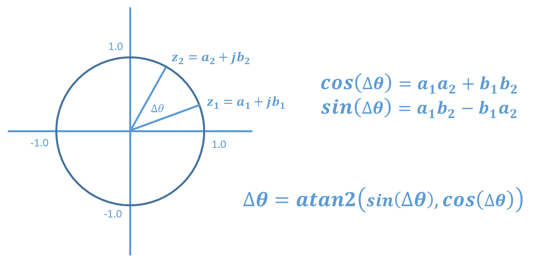 また、入力信号とソフトウェアオシレータの生成信号との位相差を計算する処理にも工夫を加えました。ここでは、複素数による表現を用いて、三角関数の内積と外積で位相差を求める手法を採用しています。